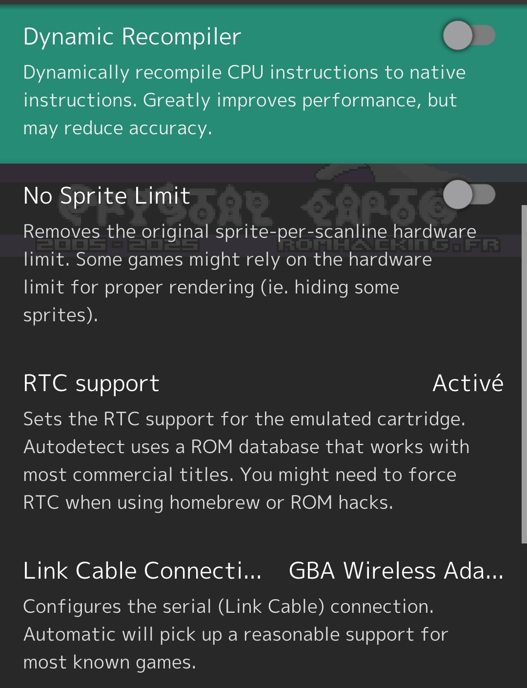 - Sur consoles R36S / mobiles Android, ce jeu est compatible uniquement avec l'utilisation de TOUS les éléments suivants : 1) Retroarch 1.21.0 - 64 bits, 2) Coeur gpSP, 3) Fichier "gba_BIOS.bin" à placer dans RetroArch/system - non fourni pour des raisons légales, CRC32 : 81977335 - , 4) Options du coeur gpSP : "Dynamic Recompiler" désactivé, "RTC support" activé, "Link Cable - GBA Wireless Adapter" activé).